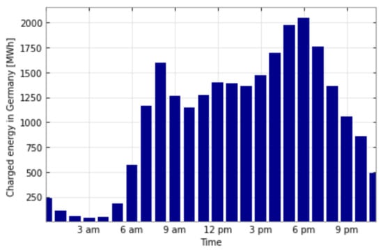 For all BEVs, the cumulative average charged energy represents a typical pattern. In order to consider spatial aspects, the plug-in and plug-out times of the different federal states in Germany are shown in Appendix A (cf. Figure A1). The main trend was very similar, but there were differences in the number of BEVs and the related spatial charged energy (cf. Figure A2).