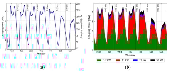(a) Average power profile, aggregated (left axis) and proportional (right axis); (b) Average charging profile differentiated by the charging power used.