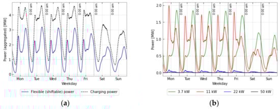 (a) Average power profile and flexible (shiftable) power; (b) Flexible (shiftable) power per charging power used.