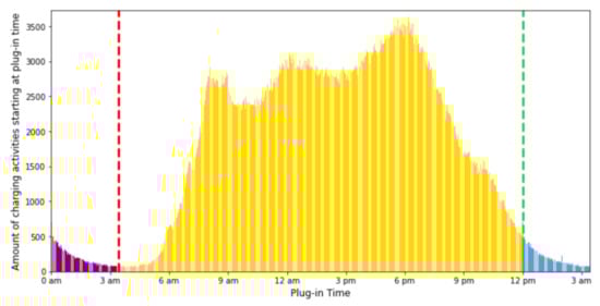 The data involves the date and time of both BEV plug-in and plug-out. These continuous values are difficult to cluster as they do not concentrate on one single day and, therefore, are spread across the whole year. Hence, the dataset was adjusted to enable useful clustering. The first step was based on the assumption that all charging activities started at the same day. The plug-in time was implemented as plug-in time at minute of the day. This approach had the shortcoming that the considered period started at 12 a.m. and ended at 11:59 pm. Early and late plug-in times might not be clustered into one cluster because they lost their spatial proximity. The distribution of the plug-in times is shown in Figure 5. It is visible that the charging activities decreased in early morning hours and increased again later; forming a turning point at around 3 a.m. (red dashed line). To restore the spatial proximity, all charging activities with a plug-in time below this minimum (purple bars) were moved to the right side (blue bars) to continue the time after 12 pm (green dashed line). The data covered by the purple bars was removed to avoid repetition.