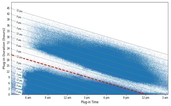 The y-axis covers the plug-in duration and, therefore, added dashed lines depict the plug-out time. Two clouds can be observed. All data points above the midnight line (red dashed line) represented charging activities, which ended on another day; all below represented same-day charging activities.