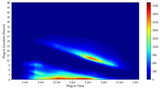The second feature used for the clustering approach was the plug-in duration. However, the plug-in duration of the different charging activities differs significantly. Some BEVs are plugged-out after a few minutes, while others are plugged-in for several days. Such a dataset repeats itself, creating a cloud of data points for each day (one cloud for the BEVs disconnecting on the same day, one cloud for BEVs disconnecting on the second day, one for the third day, and so on) and making it impossible to gain meaningful clustering results because the clustering might only concentrate on the daily clouds instead of intraday activities. Therefore, we adjusted the data in such a way that all charging activities, which neither ended on the same day nor the next day, ended on the next day, but kept the original plug-out time. This way, two clouds occurred: one for the same day charging activities and one for the overnight charging activities. In addition, the plug-in duration was comparable. The final adjusted data is depicted in Figure 6.