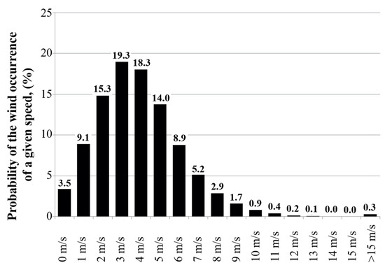 The probability of the wind appearance of a certain speed in the RBG’s area (according to [75], based on [77]).