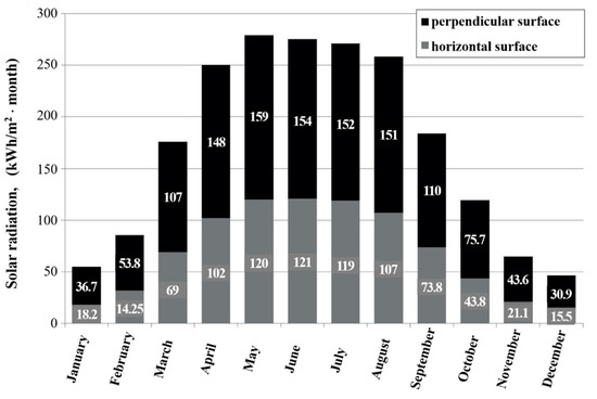 The insolation on horizontal and perpendicular surfaces to the sun’s rays on the SBG’s area (according to [74,75,76], based on [77]).