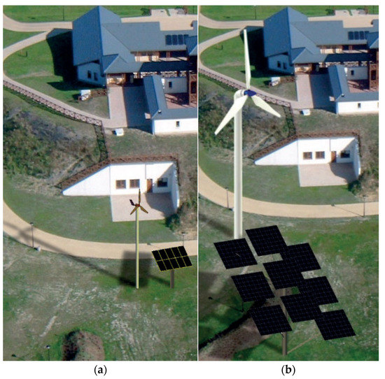 Visualization of the wind turbine and photovoltaic installation for the needs of the SBG: (a) a system that meets 5% of the energy demand; (b) a system that meets 100% of the energy demand [77].