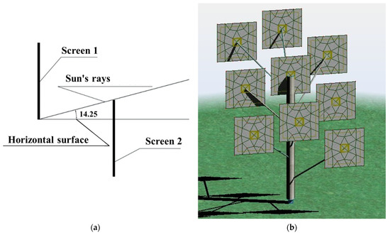 where, Es is the annual energy production from a PV panel operating under existing insolation conditions, U is the energy efficiency of 1 m2 of the surface perpendicular to the sun’s rays (U = 1220 kWh/m2 per year), A is the area of one PV module (A = 2.0 m × 1.0 m = 2.0 m2), n is the number of PV modules with photovoltaic cells (n = 10), η is the efficiency of photovoltaic cells (η = 0.13), and φ is the safety factor that takes into account the heterogeneity of atmospheric conditions (φ = 0.75).