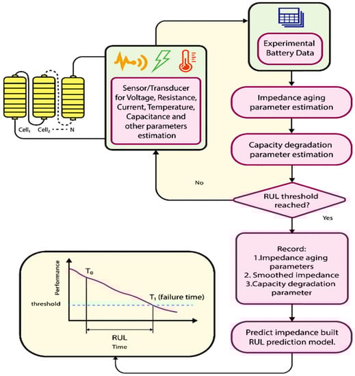 The status of batteries can be monitored through prognostics and health monitoring frameworks. Health monitoring is assigned with the task of detecting the underlying degradations and preventing the potential faults, while prognostics is responsible for predicting how soon a product will progress toward failure []. PHM techniques are normally comprised of three primary components: condition monitoring, data acquisition, and health diagnosis. Condition monitoring is concerned with battery performance and deriving the crucial aspects of battery performance such as voltage, current, charge, and discharge capacity. Data acquisition is assigned with the task of obtaining the required performance indicators and health diagnosis is responsible for estimating the state of health of the batteries [].