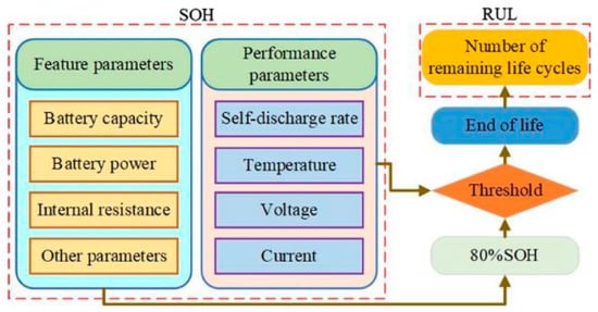 To give perspective into the utilization of health characteristics criteria in battery management strategies, many studies have been conducted to achieve such a goal. Zhang and Lee [] reviewed the research progress on prognosis and health monitoring of LIBs, and summarized the algorithms for SOC prediction and remaining service life estimation. Watrin et al. [] introduced three different adaptive systems (Kalman filter, artificial neural network, and fuzzy logic system), and analyzed their respective uses, advantages, and disadvantages. These three models can be used for SOC and SOH approximation. At the same time, Barr é et al. [,] summarized the development and related research of LIB health management systems in other fields, and briefly introduced the methods, algorithms, and models of battery RUL prediction and SOH approximation, as well as data-driven methods. Li et al. [] reviewed the health assessment and health prognosis of LIBs based on data-driven methods. In 2019, Meng and Li et al. [] conducted a literature review on the prediction and health management (PHM) technology of LIBs. In 2020, Tian et al. [] reviewed the SOH of LIBs, analyzed the causes of battery aging, summarized the SOH prediction methods, and further analyzed the main advantages and disadvantages of each technique. The above reports focus on the review of PHM and its related algorithms and mathematical models, further illustrating the important role of battery health characteristics criteria in battery management. The data acquisition process for RUL prediction of LIBs is shown in Figure 2, which can also be applied to SSBs. In this process, a specific battery cell is selected and reliable parameter data are obtained with the help of measuring elements. Then, these data are used to construct health indicators to estimate the RUL of batteries. The relationship between SOH and RUL is depicted in Figure 3. By estimating SOH and predicting RUL, the performance of the battery can be known in real-time and the battery life can be informed accordingly to ensure the safe and reliable operation of the power system or battery pack.