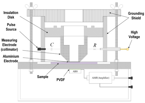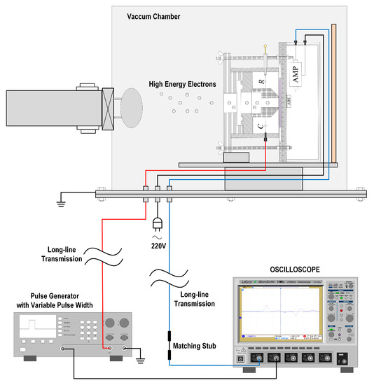 To further carry out in-situ measurement under high-energy electron radiation, the whole electrode system was placed in the vacuum chamber, as shown in Figure 2, and the pulse and the measurement signals were transmitted through a long-distance transmission line. So, a short matching wire was connected to eliminate distortion of the measurement signal after long-distance transmission. For the in-site measurement, the deposited charge inside the sample originated from high-energy electrons, thus only a pulse was needed to measure the charge distribution.
