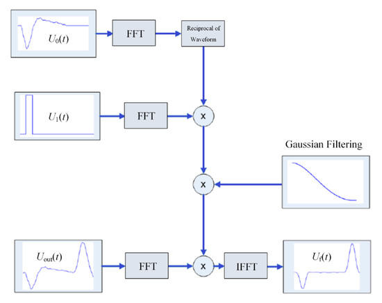 where Uout(f), Uf(f) and H(f) are the Fourier transforms of Uout(t), Uf(t) and h(t) in the frequency domain, respectively, while H(f) is called the transfer function of the system. To obtain the transfer function of the system, the impulse response of the system must be obtained. Therefore, a reference signal U0(t) was generally selected from a sample with few internal defects, and the measured waveform was ensured without obvious charge injection under DC voltage application mode. Therefore, the specific process of waveform recovery is shown in Figure 3.