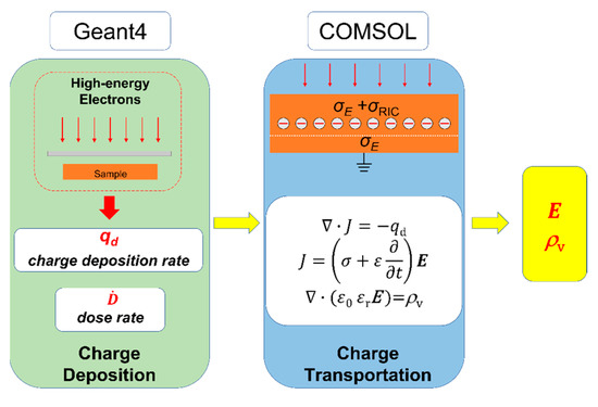 The space environment is one of the most complex and changeable environments known so far. The interaction between energetic particles, such as high-energy electrons and the spacecraft dielectrics, can easily lead to the charging–discharging phenomena of the materials, which threatens the safe operation of the spacecraft [1,2]. When the high-energy electrons (0.1~10 MeV) penetrate the shielding layer and are eventually deposited inside the dielectric, the internal charging appears. Since the charge release rate of the dielectric material is much lower than its charge deposition rate, the accumulation of charges inside can easily lead to electric field concentration. When the electric field strength generated by the deposited charges exceeds the breakdown threshold of the material, electrostatic discharge (ESD) will be induced [3,4]. Therefore, to ensure the operational safety and long life of the spacecraft, the internal charging level of the dielectrics should be evaluated in a space radiation environment.
