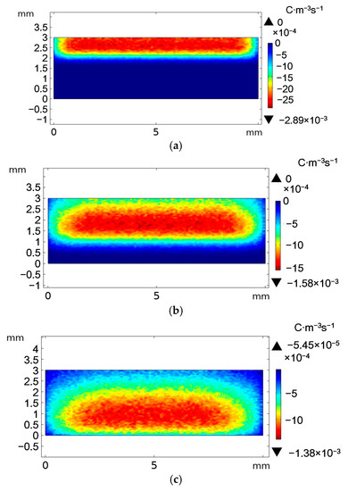 Then the charge deposition rate in the PI was obtained, as shown in Figure 8. The upper and lower surfaces of the sample were further grounded in COMSOL calculation to obtain the deposited charge density according to Equations (6)–(8).