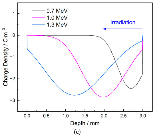 - In the simulation method, the charge transportation to the ground through bulk conduction is considered with constant charge injection. Therefore, the overall charge amount in the sample will be equal under the same radiation time, and thus the area enclosed by the horizontal axis and charge density curve are almost the same under three energies in the simulation calculation. However, the measurement results of the total charge amount among the three energies show an obvious difference, which may be due to the more intense charge release process caused by the higher electric field near the grounded electrode.