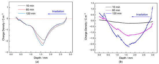 The electron radiation time was changed while we maintained the other configuration; the deposited charge of the same PI plate sample was performed. The beam density was 50 pA/cm2, with an energy of 1.0 MeV. The deposited charge distribution was obtained when the radiation time was 10 min, 60 min and 120 min, as shown in Figure 10a.