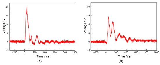 In Figure 11a, the typical ESD waveform is a narrow discharge pulse with a pulse width of about 100 ns, and the pulse rising time is less than 20 ns. There will be a damped oscillation that gradually decays to zero. However, due to the inhomogeneity of the material, the disturbance of the high-energy electron generator and the multi-point discharge, the ESD waveform has poor repeatability and even waveform bifurcation appears, as shown in Figure 11b. Through plenty of ESD experiments and statistical analyses, the average discharging duration is about 200 ns, and the average single discharging quantity is about 1.0 × 10−6 C, with a relative error ±30%. During 20 min of electron radiation, the total times of discharging and the initial discharging time of PI under three groups of beam current were recorded, as shown in Table 4.