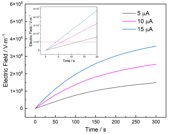 According to the guideline of the spacecraft protection manual [13], the ESD threshold of the dielectric is generally 2 × 107 V/m, and in some more severe occasions, 1 × 107 V/m is used for internal electric field risk assessment. Here, we chose 1 × 107 V/m as the threshold electric field strength. From the simulation results in Figure 13, it can be obtained that the initial discharging time under the three beam currents, namely the maximum electric field strength equal to threshold value for the first time, is 13 s, 6 s and 4 s, respectively. The result is in good agreement with the experimental results in Table 4.