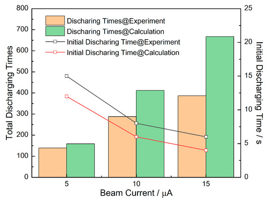 From Figure 14, the simulated initial discharging time of the PI under different beam currents is basically consistent with experimental results. On the other hand, for total ESD times during the 20 min radiation, the simulation method has a good correspondence with the experiment, especially under the condition of lower beam current. The difference of the discharging times becomes larger when the beam current increases to 15 µA, and the following two points should be further considered. Firstly, in the ESD measurement under larger beam current, there may be micro-discharge processes that are beyond the capture ability of the testing system. In addition, except for single-peak ESD in Figure 11a, there is also multi-peak discharging, such as in Figure 11b. This kind of ESD waveforms might be caused by two time-superimposed discharging at different locations, but they are counted as a single ESD in our experiment. Combining the above two situations, the number of internal discharging obtained in the experiment should be less than that of the simulation.