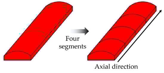 The core material selected (35PN360) was 0.35 mm thick and was produced by POSCO (Korea). To realize high torque density, N42UH, which is a neodymium-iron-boron permanent magnet, was used. The residual flux density of N42UH is 1.35 T at 20 °C. However, its value of 1.247 at 60 °C was selected considering the design margins and change of the magnet temperature during operation. To reduce the PM eddy current loss, the PMs were divided into four segments in the axial direction as shown in Figure 2.