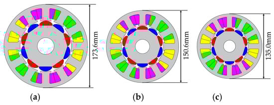 The specifications with the same conditions are presented in Table 1. Every model has three-phase winding with the wye (Y) configuration. The same conditions are more focused on electromagnetic constraints than mechanical constraints. With this approach, it can be found how much the size of each model is changed. The finite element analysis (FEA) was conducted using ANSYS Electronics Desktop 2021 R2 and ANSYS Motor CAD 2021 R1.