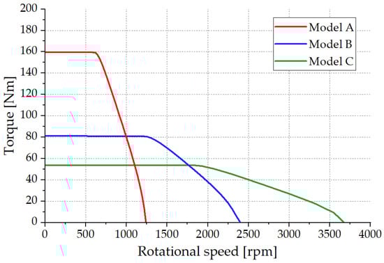 Figure 4 shows the torque-speed curves of the three types of 10 kW SPMSMs. As seen in the figure, a 10 kW podded propulsor (Model A) with low speed and high torque can be used to turn a large-diameter propeller. In contrast, Model C, with high speed and low torque, is better suited to turn a small-diameter propeller.