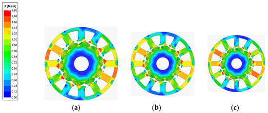 Flux density of the new 10 kW SPMSMs: (a) Model A, (b) Model B, (c) Model C.