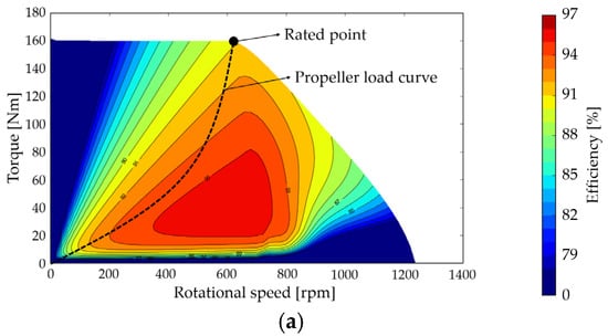Figure 6 shows the efficiency maps for the newly designed models. The overall contours of the efficiency maps are high in terms of an assumed propeller load curve which can be calculated from Equation (1).