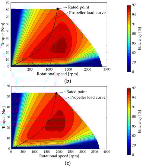 Efficiency maps of the new 10 kW SPMSMs: (a) Model A, (b) Model B, (c) Model C.
