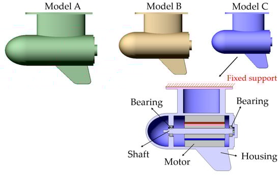 The modal acoustic analysis results by FEA (in air and water) for each podded propulsor are indicated in Table 4. It is obvious that the natural frequencies of podded propulsors in water are lower than those in air. This is due to the added mass effect of water because the density of water is much higher than that of air (as specified in Table 3). Generally, the natural frequencies decrease when the mass of a structure increases. Therefore, the natural frequencies of Model C, which has the lowest mass and volume, are higher than those of the other models.