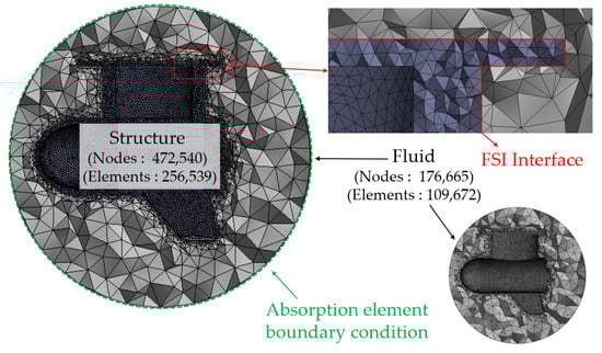where is the element shape function for displacements, is the element shape function for pressure, and is the outward normal vector at the fluid boundary. is the surface. From Equation (4), it indicates that the FSI depends on the mass and stiffness terms except for the damping. From Equation (5), it is recommended that the nodes of the structure be in contact with the nodes of the fluid for the FSI interface.