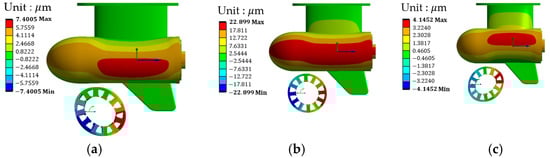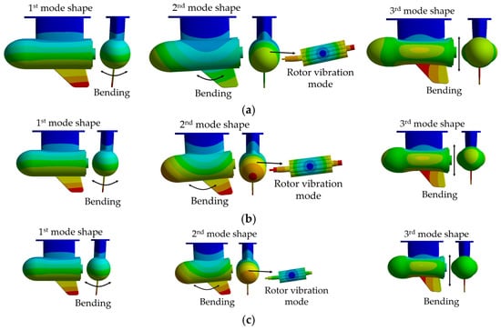 It is noteworthy that the mode shapes in water were not changed, compared to those in air, as presented in Figure 9. Each mode has the bending mode, but its direction is different. It is the direction of vibration that is generated when an operating frequency is close to or equal to the natural frequency. The deformation of mode shapes was generated for the housing with the stator in 1st and 2nd mode; whereas, the rotor vibration mode was generated in the 3rd mode. This has effects on the housing that cause deformation of the housing and the stator.