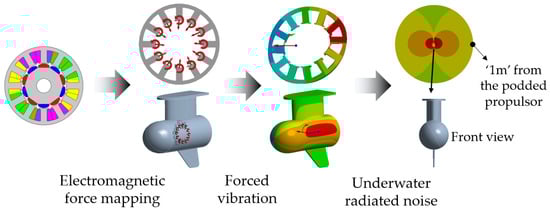 Forced vibration and underwater radiated noise analysis of the podded propulsors were conducted based on electromagnetic force. A flowchart of the analysis is presented in Figure 10.