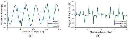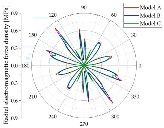 where is the magnetic permeability of free space (air or vacuum). and are the radial flux density and tangential flux density in the air-gap. The unit of the radial electromagnetic force density is Newton/square meter which equals to pascal (symbol: Pa). Figure 11 shows the radial electromagnetic force density in the air-gap at a single point calculated from the air-gap flux density on the load as shown in Figure 12. The radial electromagnetic force density of each model shows the difference, but it is not significant.