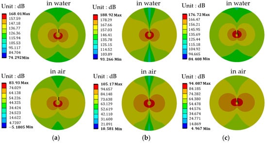 Table 5 indicates the vibration response displacement and radiated noise analysis results at the rated output power. It is confirmed that the URN in water is higher than in air. The contour of vibration response displacement and radiated noise are presented in Figure 13 and Figure 14. For radiated noise analysis, the fluid boundary region for the sound field is built expecting the modeled podded propulsor. The analysis results of Model B show that the vibration response displacement is the highest value, and thus its radiated noise calculated at 1 m distance is also higher than those of the other models. This is because the 1st natural frequency of Model B (indicated in Table 4) is close to its pole-passing frequency, which means it is near the resonance point.