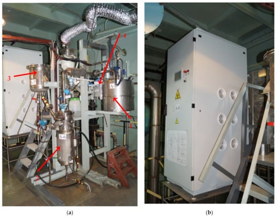 General view of the installation: (a) 1, the resonator chamber with the crucible; 2, the bubbler; 3, the dispensing vessel; 4, the waveguide) and (b) the magnetron control box.
