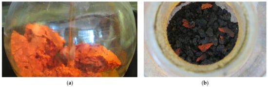 Appearance of the uranium powders obtained in the laboratory microwave denitration unit during the denitration of the uranyl nitrate solution: (a) after uranium trioxide sintering and (b) the final stage.