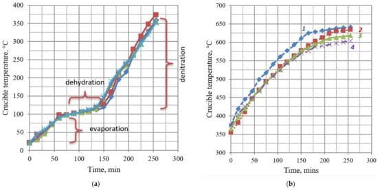 In all experiments, the solution volume and the initial metal concentration were the same, i.e., 4 L and 450 g/L of metal, respectively. During all stages of the process, the crucible temperature was recorded. Figure 4 displays the temperature dependence plots. As shown in Figure 4a, evaporation, removal of crystallization water, and denitration both for the individual solution of uranyl nitrate and for solutions of uranyl nitrate containing 10 to 30% of Ce nitrate heat up the product in the crucible homogeneously, indicating the absence of phase transitions. The heating rate depends only on the applied microwave power and the heat loss. During oxide production, the maximum achieved temperature was observed to be directly dependent on the cerium content. This dependence is shown in Figure 4b. This is probably due to different thermal conductivity values of U and Ce oxides.