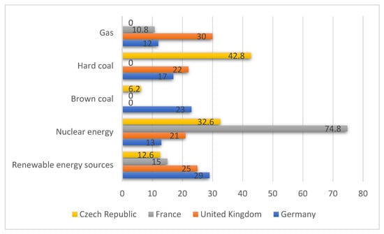 The energy sources used by Germany, the United Kingdom, France, and the Czech Republic, Europe’s major countries until 2018. Source: www.wysokienapięcie.pl (accessed on 11 August 2022) [13].
