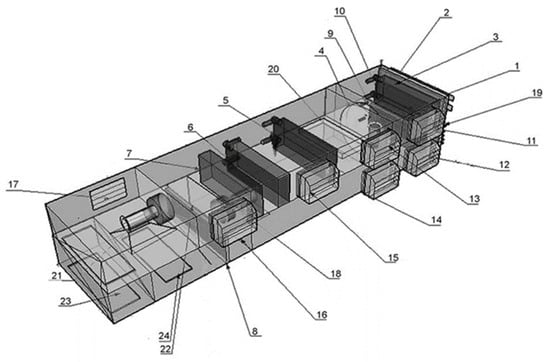 The main focus of the research presented in this article is nature and turning our attention to an alternative natural, green, and energy-efficient resource of energy accumulated in groundwater. It is worth emphasizing that this energy is unlimited, free, and available across about 70% of this country’s area, making it possible to heat ventilation air in winter from −20 °C to, for example, +7 °C, and allowing the cooling of ventilation air in the summer from an outdoor temperature of +35 °C to +22 °C. These parameters form the basis of research and are cause for optimism in considering CO2 reductions in Heating, Ventilation, and Air Conditioning systems (HVAC) [28,29]. The HVAC system is exactly the same as a traditional installation, except that in FCH HVAC, installations have an additional system of lateral air intakes and outlets that reduce electricity consumption by about 10%. The design has not changed, so rotary exchangers, cross-flow heat exchangers, and other recovery methods along with mixing chambers can be used in this system. In the FCH HVAC system, coolers and FCH heaters are introduced in addition. Details of this solution are available in patent P-229828 [30]. See these differences in Figure 2, which presents a FCH glycol 35% heater–cooler functioning as a heater in winter (item 5), with a temperature range from −18 to +7 °C, and as a FCH cooler (items 11–17).