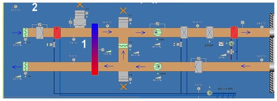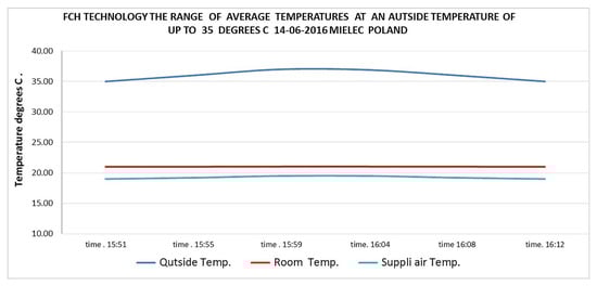 The amount of obtained energy and confirmation of results for winter can be read directly from the BMS chart in Figure 4 (2), where outdoor temperature is −18.3 °C and the amount of air is 9000 m3/h, and inFigure 4 (1), where the temperature behind the FCH heater is 7.6 °C and the power is 0.34 × 9000 × 25.9 = 79.25 kW.