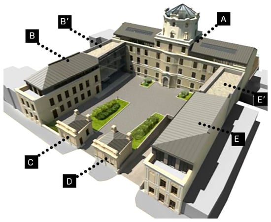 View of the visualization of the Sobieski Palace in Lublin. (A) Main palace building, (B) left wing, (B’) new facade of left wing, (C) left-hand cordeguarde, (D) right-hand cordeguarde, (E) right wing, (E’) new facade of right wing and entrance to the underground car park. Source: the authors.