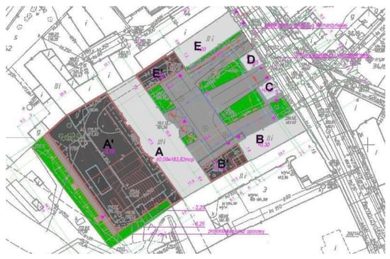 View of the development plan of the Sobieski Palace in Lublin. (A) Main palace building, (A’) underground car park, (B) left wing, (B’) new facade of left wing, (C) left-hand cordeguarde, (D) right-hand cordeguarde, (E) right wing, (E’) new facade of right wing and entrance to the underground car park. Source: the authors.