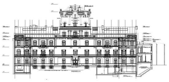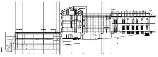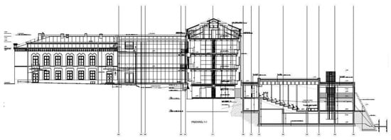 Figure 9 shows the auditorium—a multimedia room for 196 viewers with the possibility of organizing lectures, conducting dialogues using audiovisual means at symposia, and conferences (projection and simultaneous interpreting booths). It is accessible from the ground floor of building A by a panoramic lift and a staircase, through the hall, and from the first level of the parking lot through a lock at the level of −3.15 m (the second level of the car park, the level of the existing foundations of the palace) and 25 m along the showroom with a panoramic view of the city of Lublin. The two-level underground parking is accessible by an exit to the courtyard at the −3.15 m level. Access to the parking lot at the −3.15 m and −6.25 m levels can be obtained through the locks. The technical level at −9.35 m was designed for technical service of the facility. At this level, a boiler room, a hydrophore plant, and a ventilation room are located.
