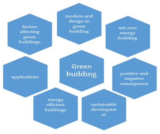 Recently, the sustainability concept has become highly significant. GBs are an important part of the sustainability concept. The GB concept requires all our resources are used in a balanced proportion, without using them extensively and would also improve the conditions of our environment and lifestyle. The operation of GBs promotes a healthy environment by reducing the load on water, land and energy resources. There are seven main components of green building, related to Life Cycle Assessment (LCA); site and structure design efficiency; efficient materials; indoor air quality enhancement; energy efficiency; water efficiency; and waste reduction. According to the Environmental Protection Agency (EPA), “green building refers to creating structures and using processes that are environmentally friendly and resource-efficient throughout a building’s life cycle, from site to design, construction, operation, maintenance, renewal and deconstruction. GBs practice design such classical buildings which keep economy, utility durability and comfort in concern”. A Green Building (GB) is also called a “sustainable or high-performance building”. The design of GBs is performed in such a way that our environment and lifestyles get better and upgraded by reducing environmental pollution, using efficient uses of natural resources and improving health productivity. A systematic review of the GBs has been reported in this paper. Similarly, the overall research and development work conducted on GB technologies has been discussed. It is expected that utilizing the renewable energy technologies in the buildings with proper planning will provide a sustainable solution for the GB Field. Zuo and Zhao, 2014 [1], have reported that green building is a practice that is eco-friendly, improves occupant’s health, recycles and reuses sustainable material, reduces CO2 and other harmful gas emissions and encourages more plantation and greenery. Leadership in Energy and Environmental Design (LEED), Building Research Establishment, Environmental Assessment Method (BREEAM) and Green Building Council of Australia (GBCA) are rating tools that keep improving and adding new features to make the best out of GBs. GB can be achieved through three categories: technical, managerial and behavioral. It plays a crucial role in achieving net zero energy building. As the population and pollution is increasing, it is important to adopt the GB concept, and for that purpose awareness, knowledge and implementation is the key. In terms of environmental benefits, GBs saves 20–30% in water and saves 40–50% in energy, compared to conventional buildings. These buildings improve air quality by 8%. It also protects our biodiversity and ecosystem. From an economic point of view, the overall construction cost of GBs is lower than conventional building by $280–$410. Figure 1 shows the different approaches to achieve GB using various technologies. According to a benefits of GB article by United States Green Building Council (USGBC) which was accessed on 24 August 2022, buildings alone, in the United States, produce approximately 40% of the country’s CO2 emissions and use more energy and water than both the industrial and transportation sectors combined. However, LEED-certified buildings produce 34% fewer CO2 emissions, use 25% less energy and 11% less water and recycle more than 80 million tons of waste from landfills. Figure 2 shows a pie chart that demonstrates the GB that helps to decrease carbon dioxide emissions, water consumed in the U.S. and energy. LEED projects are responsible for diverting more than 80 million tons of waste from landfills, and by 2030 that number will rise [2].