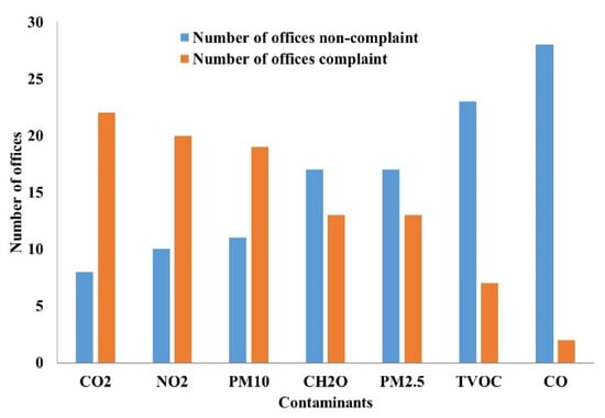 Seppanen et al., 1999 [55], analyzed the relationship between ventilation rates and occupant health in a building. The results demonstrated that illness symptoms are often related to low ventilation rates, perceptions of poor air quality and high CO2 concentrations. One of the case studies showed that most of the offices studied are not able to cope with the requirements for healthy indoor air quality. The same is illustrated in Figure 3, a survey performed by Green Business Certification Incorporated (GBCI) organization in 30 offices in 9 cities in India, on the basis of their indoor environmental quality, daylight, excess to external landscape, thermal comfort and soundscapes, were overviewed and results were that out of 30 offices, only 1 office shows all the indoor air contaminants within limits [56]. Based on data, Steinemann et al., 2017 [57], concluded that Indoor Air Quality (IAQ) is better in GBs than in conventional buildings. However, “green” doesn’t guarantee good indoor air quality. Ghodtari et al., 2012 [58], also stated that green features of buildings lead to better occupant health, increase satisfaction and improve quality of life. Khoshbakht et al., 2018 [59], stated that not all GB occupants were more satisfied than non-GB occupants. Awad et al., 2021 [60], tried to measure the indoor air pollution of buildings in Dubai. The results showed radon gas concentrations exceeded the standard. The concentration distribution of Volatile Organic Compounds (VOCs) and formaldehyde (CH2O) was about ten times more than that of outdoors.