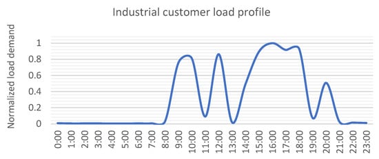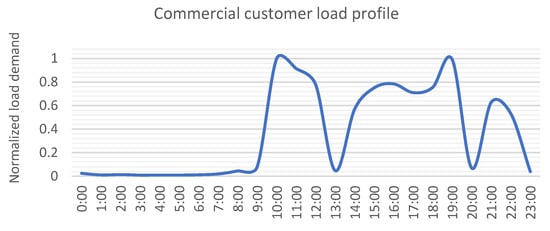 Figure 9) represents an expected behavior in non-residential clients, where a half-day work shift is observed, reaching its peak value at approximately 12:00 h, and then decreasing its demand until the end of working hours (4:00 p.m. for industrial clients, and 6:00 p.m. for commercial clients).