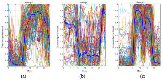 Groups obtained through K-means clustering for commercial customers with installed power greater than 10 kW, business day of summer. (a) Group 1, (b) Group 2, and (c) Group 3.