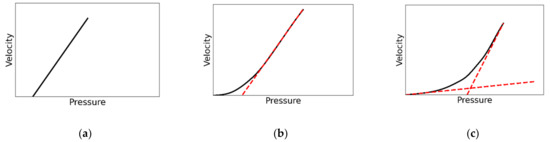 Pre-Darcian, Darcian, and Post Darcian curves—pressure and velocity relationship as grouped by Kutilek [41]. Black continuous line shows the non-linearity of Darcy law. Red-dashed line shows the expected linearity of Darcy law. (a) Linear proportionality between pressure and velocity with the curve not passing through the origin. (b) A non-linear proportionality between pressure and velocity at lower pressure and a linear proportionality at relatively higher pressure. (c) Non-linear proportionality between pressure and velocity.