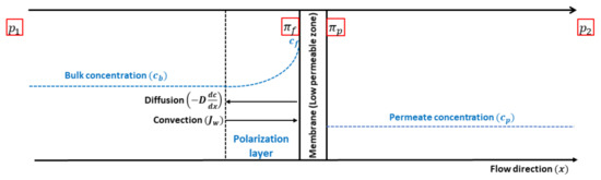When a fraction of the solute molecules is retained on the feed side of the semi-permeable membrane, the solute concentration will continue to build upon the membrane walls at the feed side. This phenomenon is termed “concentration polarization” (Figure 2) [54]. Due to concentration polarization, a boundary layer known as the polarized layer is formed. Different methods such as the classic solution-diffusion model, film theory model, and the electrolyte theory model are normally used to compute the polarized layer concentration, the concentration on the wall of the membrane at the feed-side and the permeate concentration [48]. At a steady state, the convection and diffusion process in the polarized layer reach equilibrium—the film theory assumes a multi-dimensional transport problem as a one-dimensional transport problem, as given in Equation (7). From the film theory, the relationship between the bulk concentration , the concentration on the interface of the membrane , and the resultant flux can be obtained by integrating the one-dimensional diffusion equation from the membrane interface (between zone A and B), out along the thickness of the polarized layer , which can be presented as Equation (8) [47,48,55,56]. The film theory model describes the solute accumulation at the membrane walls where the solute is transferred by convection towards the membrane and by diffusion in the opposite direction into the bulk solution [57,58,59].