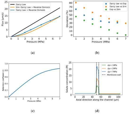 The results (Figure 4a) show that the deviation between the experimental (Darcy law + reverse osmosis) and numerical results (Sim: Darcy law + reverse osmosis) varies with pressure. Hence, the results were compared by calculating the percentage deviation for every simulated pressure difference (Figure 4b). The percentage deviation for the experiment and simulation is between 0% and 45%. The highest deviation is associated with the non-linear sections of the curve of resultant flux against the pressure difference (1 MPa and 4 MPa) and decreases as the pressure difference increases. The margin of error of the numerical simulation and the experimental results could result from the approximation of the permeability coefficient , the assumed density and viscosity of the fluid, and the possible errors from the experiment. At the highest simulated pressure point (7 MPa), the numerical results agree with the experiment results.