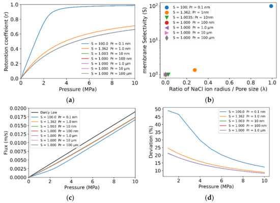 The percentage deviation from the Darcy law for the simulated pressure range and pore is between 8% and 49% (Figure 5d). The minimum deviation was recorded at the highest simulated pressure (10 MPa) and the highest simulated pore radius (100 ), while the maximum deviation was recorded at the lowest simulated pressure (1 MPa) and the lowest pore radius (0.1 nm). For the given bulk concentration of NaCl, a pore radius above 10 nm, of the low permeable zone (zone B), does not increase the deviation from the Darcy law for all the simulated pressure ranges. Regardless, there is a significant deviation from the Darcy law for micron-scale and sub-micron pore radii.